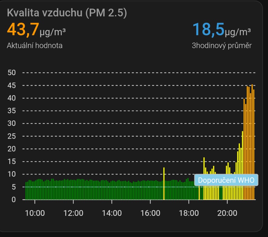 Graf ze dne pálení čarodějnic. Během dne byl vzduch v pořádku a večer vystřelily hodnoty nahoru jen tím, že lidi dělali táboráky