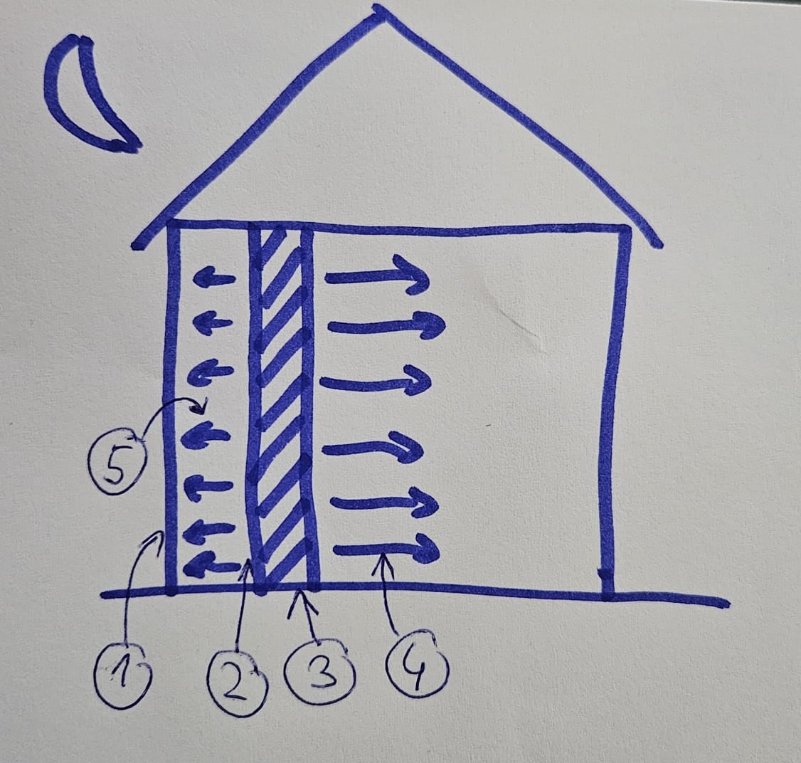 V noci teplo z Trombeho stěny sálá do interieru domácnosti Trombeho stěna se ve dne nahřívá a akumuluje teplo (1 - sklo, 2 - černá barva, 3 - stěna, 4 - sálání do interieru)