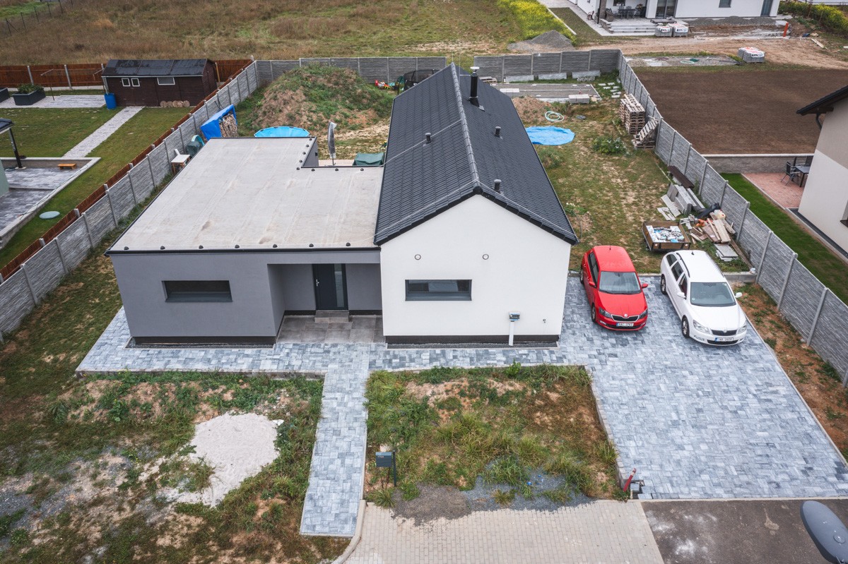 Zastřešení rodinného domu je zčásti sedlovou střechou a zčásti plochou střechou
