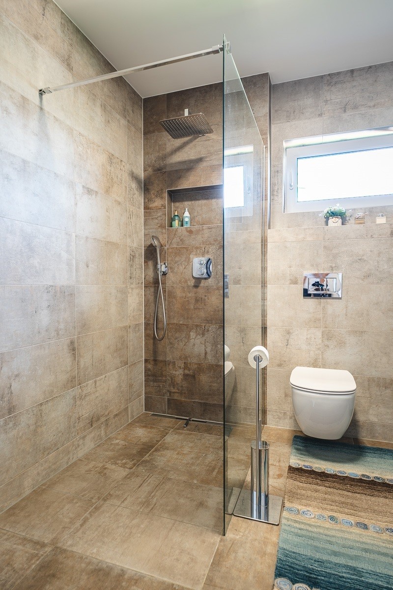 Elegantní koupelna v přírodních tónech kombinuje prostorný walk-in sprchový kout a moderní závěsné WC