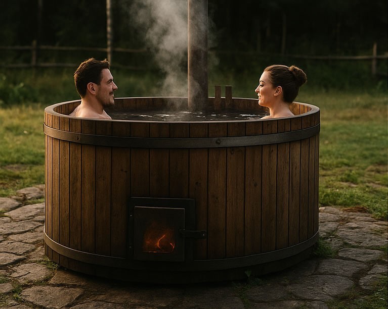 Zahradní koupací sud pro celoroční provoz s kamny integrovanými uvnitř je vhodný pro dvě osoby