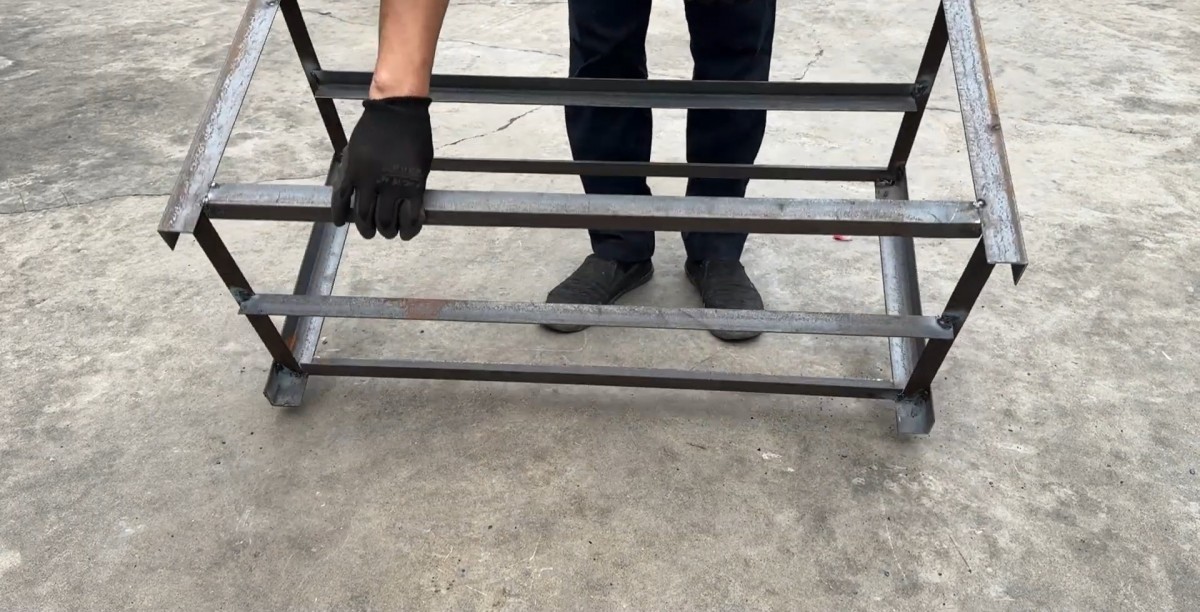 Úprava a čištění horní plochy svařeného kovového rámu.