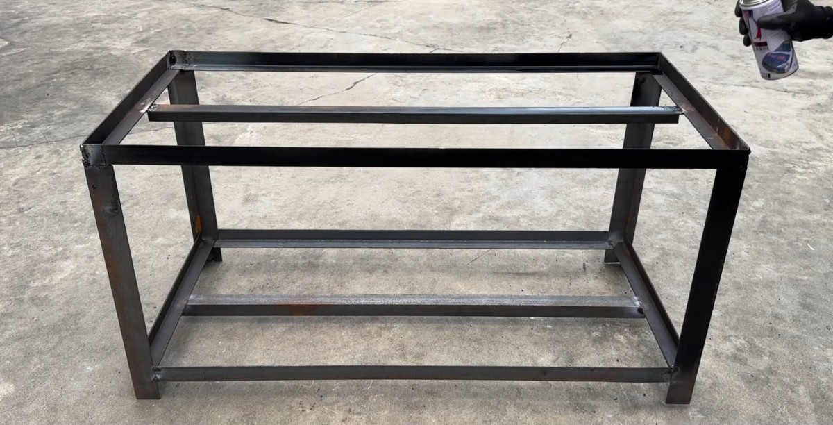 Finální pohled na dokončenou kovovou konstrukci podstavce s praktickým prostorem na dřevo vespod.