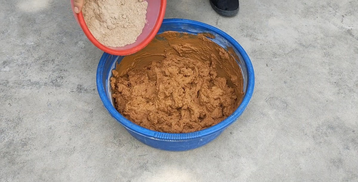 Přidávání vody do suché směsi jílu a písku v modré plastové nádobě.