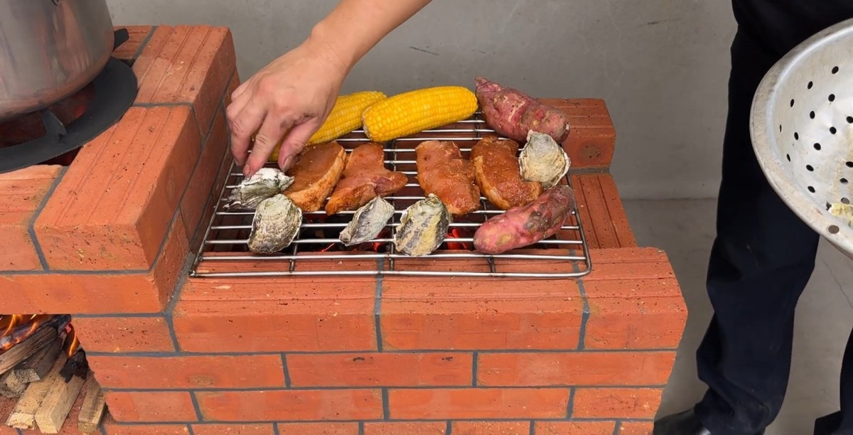 Grilování masa, kukuřice a další zeleniny na pravé straně, zatímco vlevo se vaří v uzavřeném hrnci.