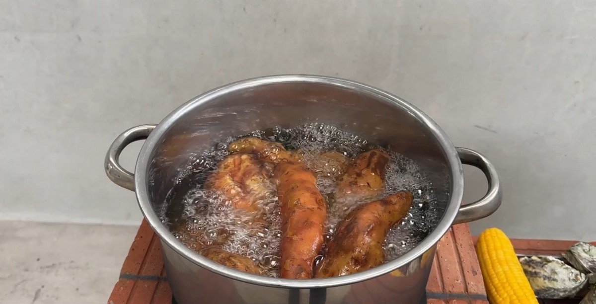 Detailní pohled do hrnce s bublajícím vařícím se jídlem na levé, více uzavřené komínové části topeniště.