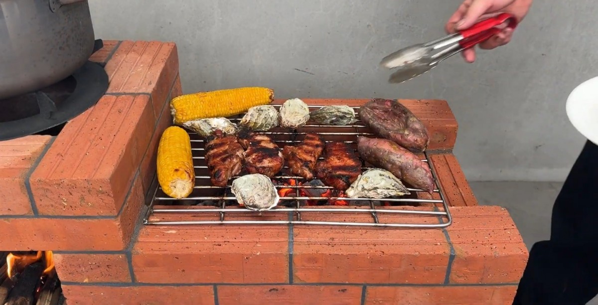 Finální idylický pohled na souběžné vaření v hrnci a grilování surovin na nových domácích kamnech 2v1.