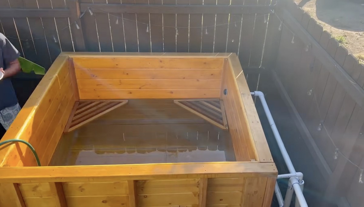 Domácí vířivka se během finálního testu napouští vodou a autor tak ověřuje, zda jeho experiment s minimálním rozpočtem skutečně funguje bez dalších improvizovaných zásahů