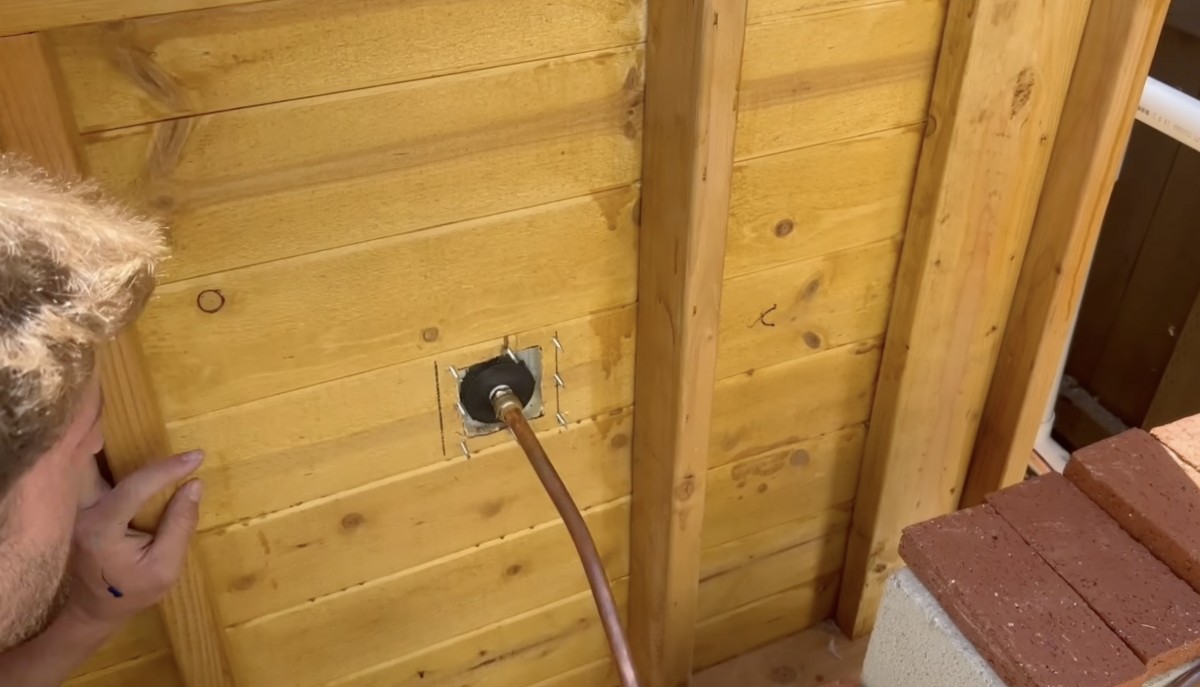 Zde připojuje k vyřezanému otvoru přívod vody, aby po předchozím testování a opravách netěsností ověřil funkčnost domácí vířivky v praxi