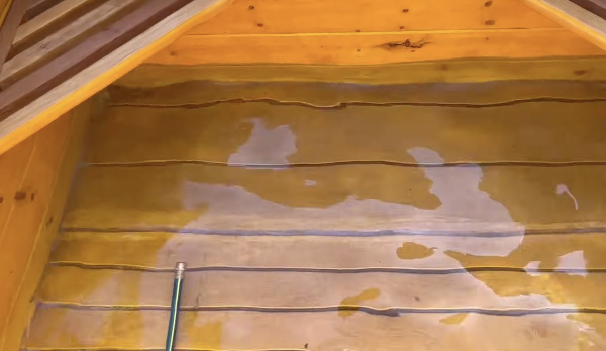 Voda postupně zaplňuje dřevěnou vířivku a odhaluje drobné netěsnosti mezi spoji jednotlivých palubek