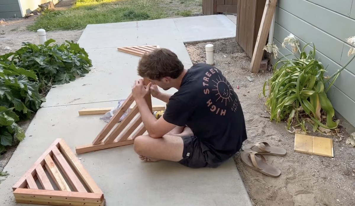 Zde si už sám sestavuje trojúhelníkovou dřevěnou výztuhu, která poslouží jako opora konstrukce vířivky