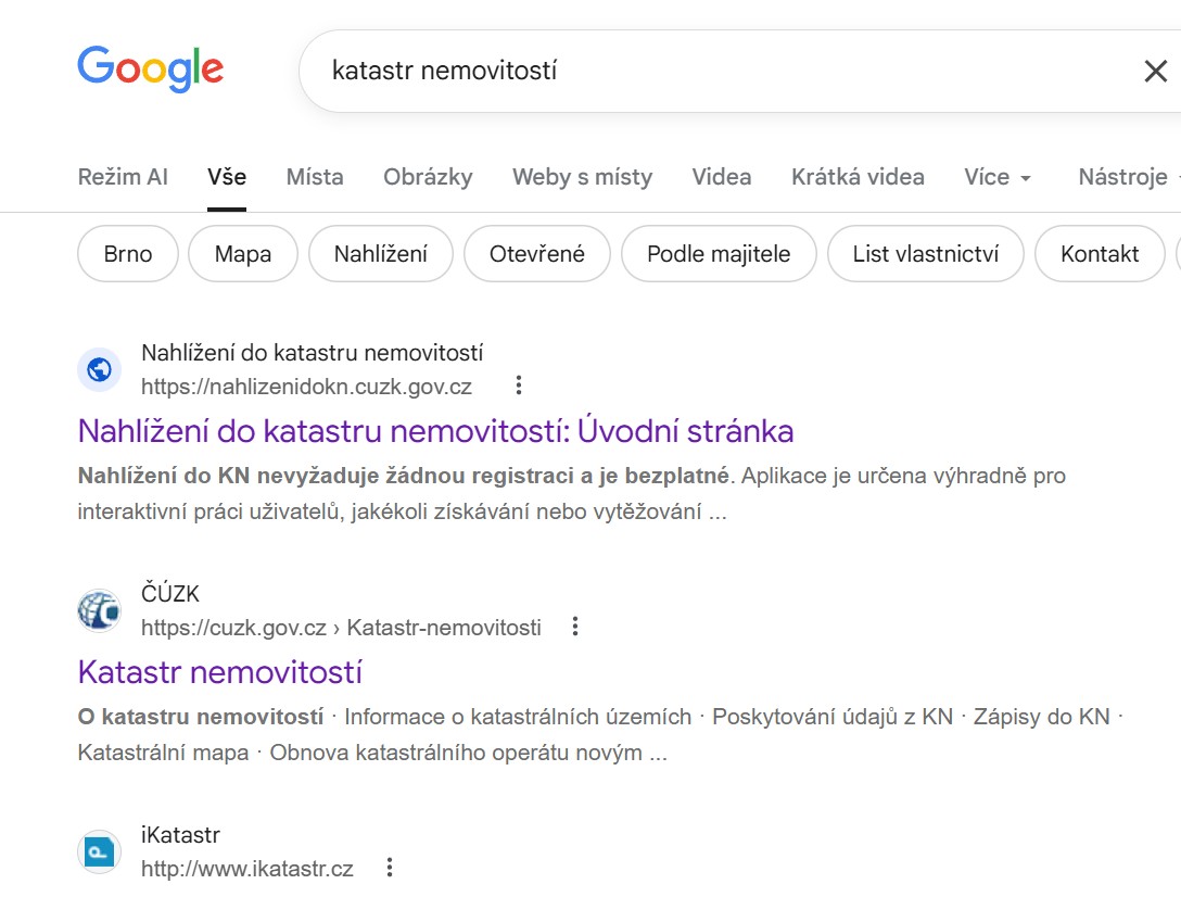 Zadejte do vyhledávače „katastr nemovitostí“ a otevřete druhý odkaz