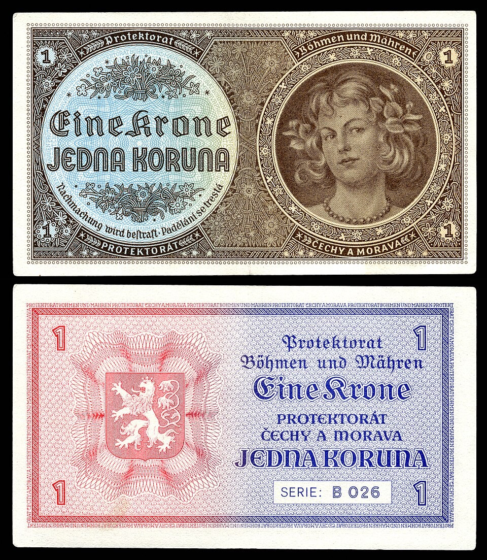 Bankovky Protektorátu Čechy a Morava v hodnotě 1 koruny (1940) byly vydávány během německé okupace Č