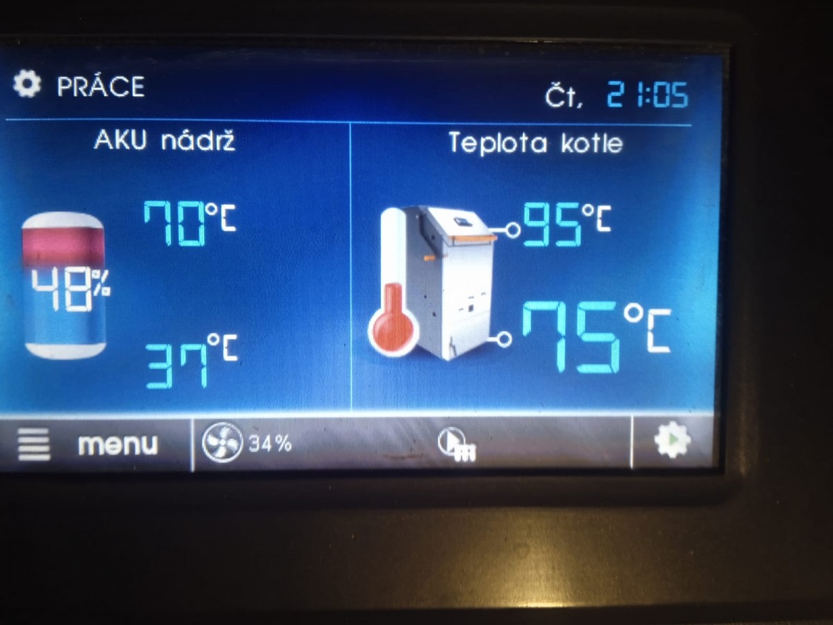 Stav kotle v 21:05. Na displeji můžete vidět teplotu kotle