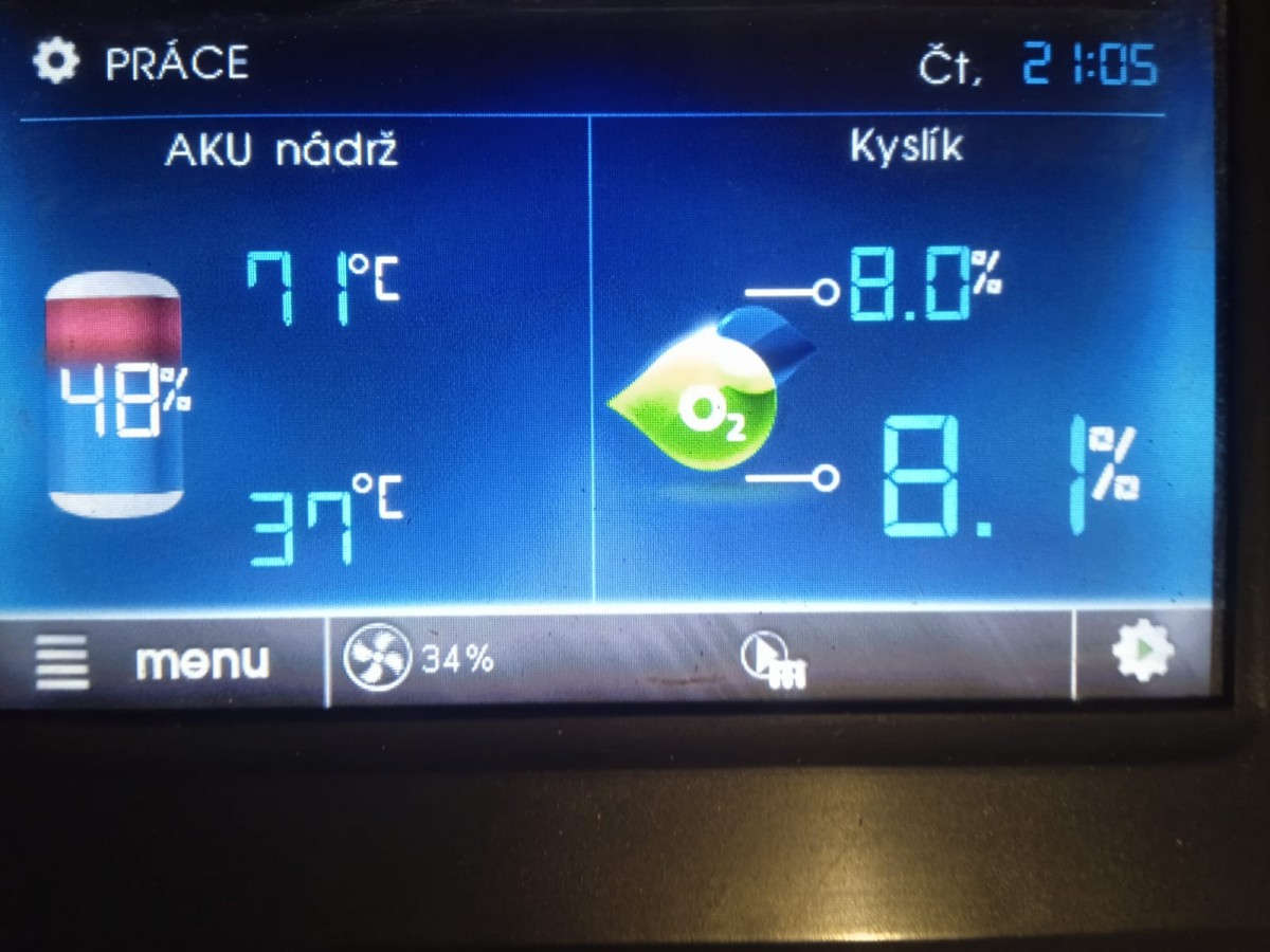 Stav kotle v 21:05. Na displeji můžete vidět stav kyslíku