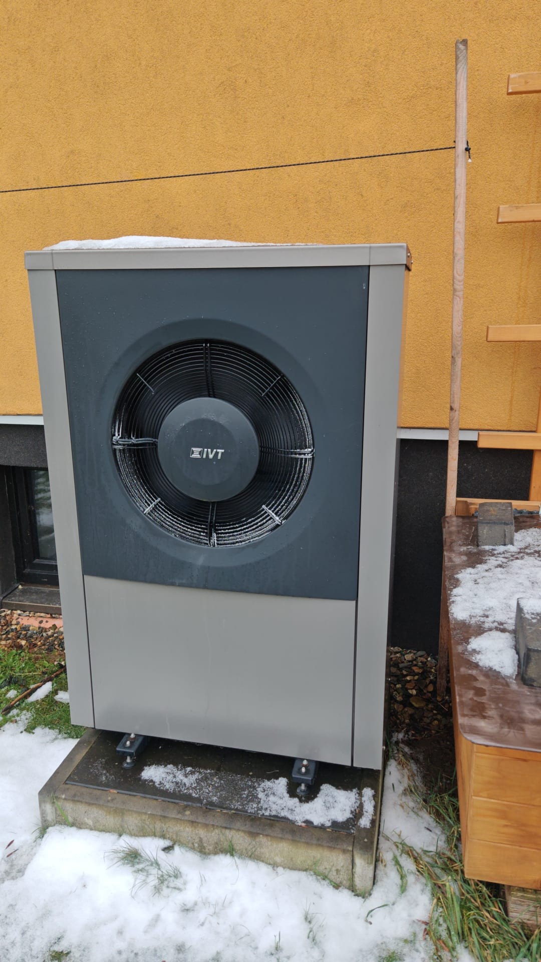 Venkovní jednotka tepelného čerpadla vzduch-voda, pomocí kterého Jiří dům v horách vytápí