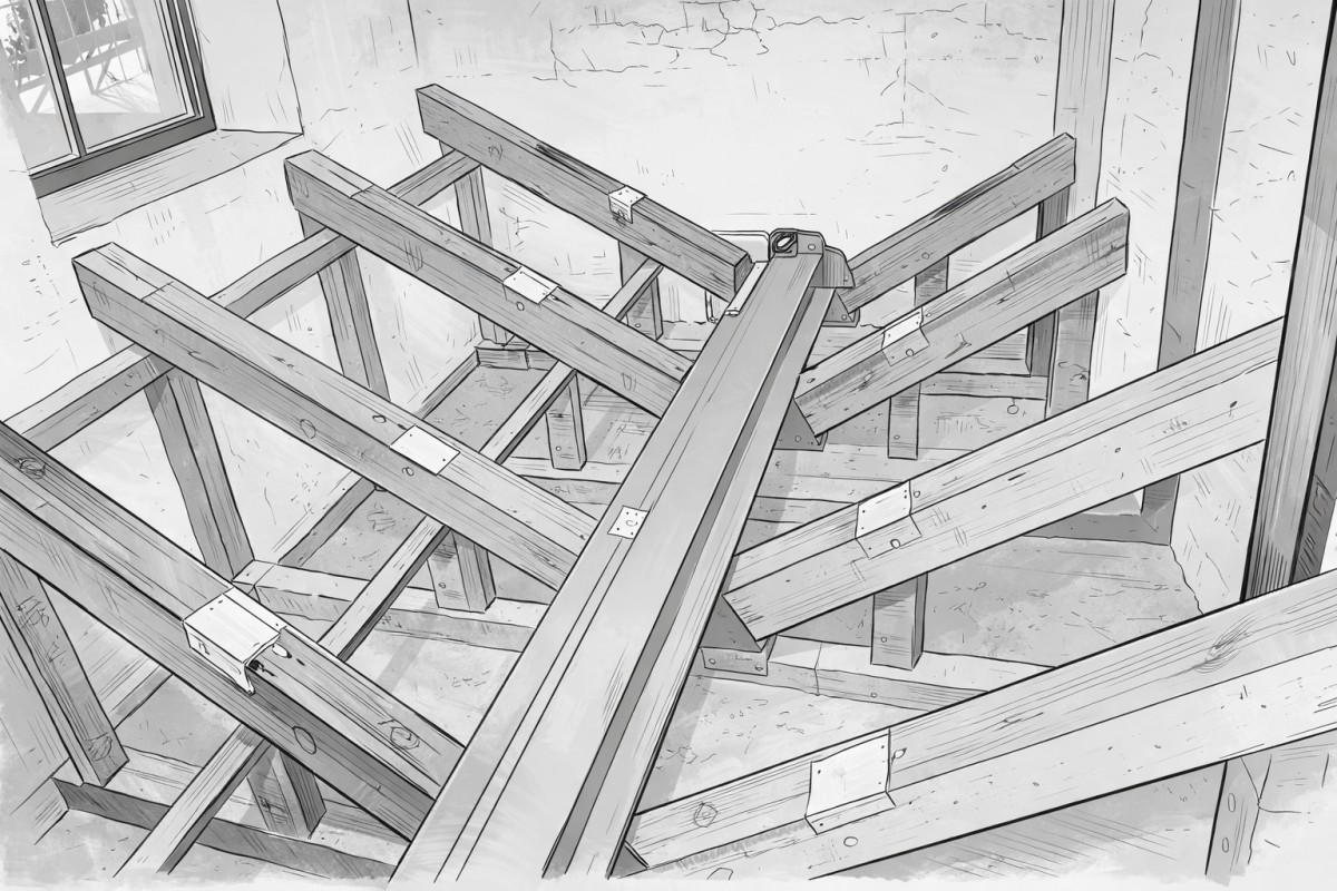 Vzniká nosná konstrukce šikmého dna z dřevěných rámů kotvených do stěn. Správný sklon zajistí plynulý sesuv pelet k dopravníku