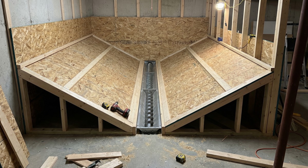 Hotové šikmé dno svádí pelety ze všech stran k centrálnímu dopravníku. Symetrie zajišťuje rovnoměrné vyprazdňování sila