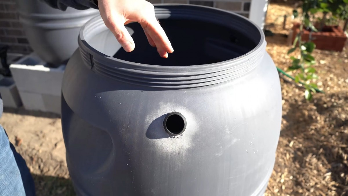 Zasuňte ohebnou hadici od okapového sběrače do vyvrtaného otvoru v sudu. Zajistěte, aby spoj dobře a pevně těsnil.