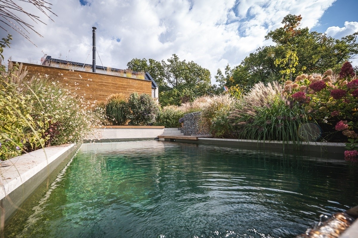 Koupací biotop je navržen jako přirozená součást zahrady, kde čistotu vody zajišťují rostliny a biologická rovnováha bez použití chemických přípravků