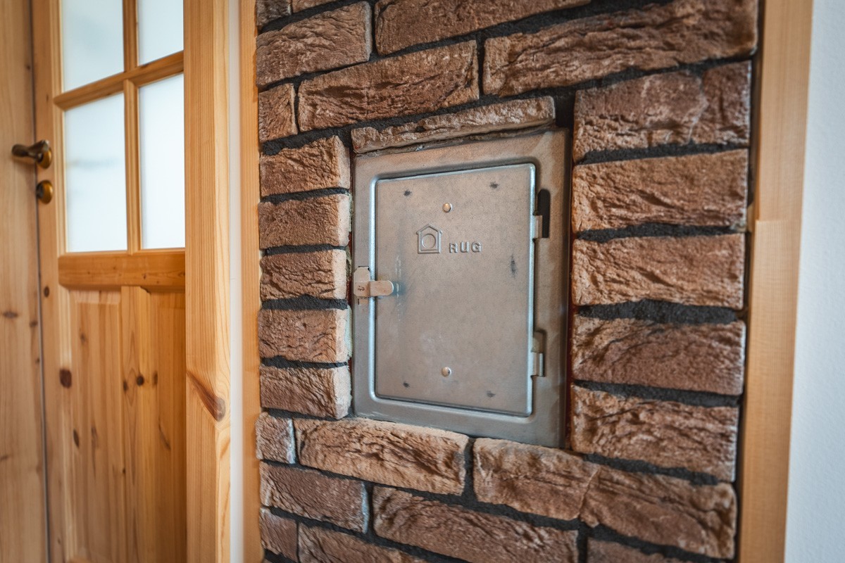 Revizní (či vymetací) dvířka jsou navržená v předsíni. Z druhé strany je obývací pokoj s krásnými kachlovými kamny