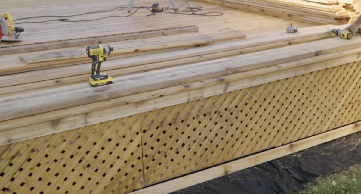 Boční stranu terasy lze zakrýt dřevěnou mříží, která konstrukci esteticky uzavře, ale zároveň ponechá prostor pro odvětrávání podlahy