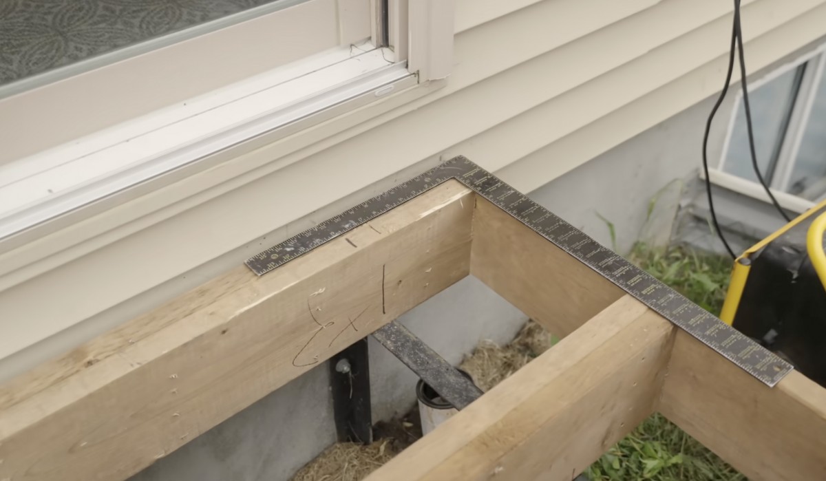 Při stavbě konstrukce terasy je důležité pravidelně kontrolovat pravé úhly pomocí tesařského úhelníku, aby byl celý rám přesný a prkna na něj později správně navazovala