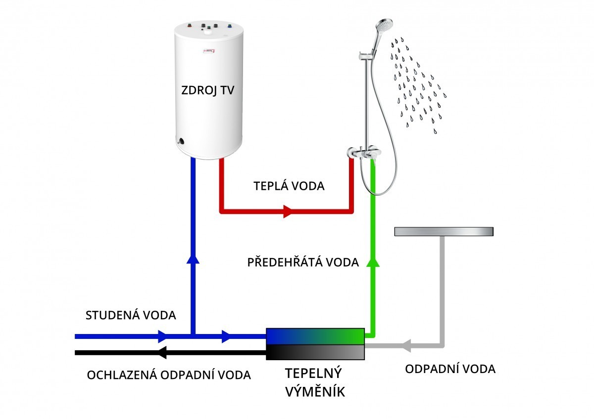 Schematické znázornění zjednodušeného řešení odběru tepla z odpadní vody pro předehřev studené vody
