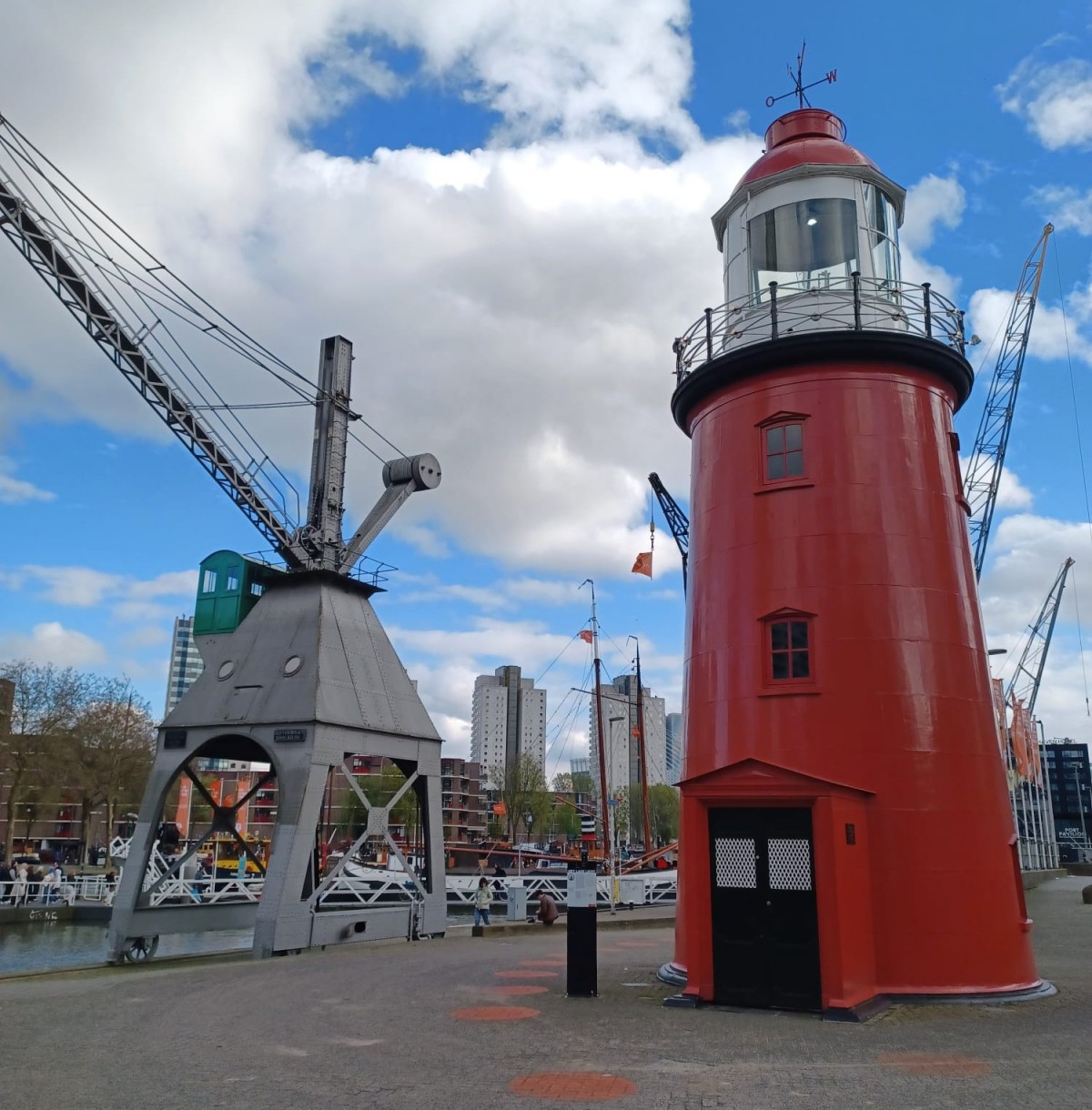 Jeřáby vedle majáku nejsou dekorace – jsou to zachované původní přístavní stroje, které ukazují, jak se dřív ručně nakládalo zboží
