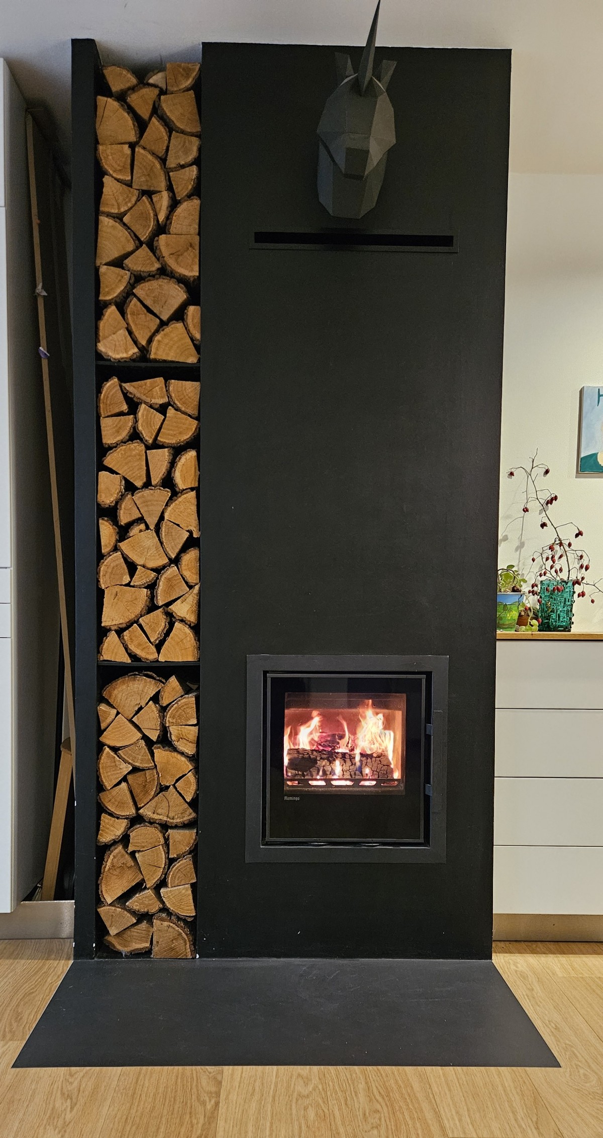 Krbovou vložku si majitelé domu pořídili před čtyřmi lety a i po této době jsou s výběrem spokojeni a neměnili by. Hlavním záměrem koupě bylo zajistit si záložní zdroj tepla pro případ výpadku dodávek plynu nebo elektřiny. Přestože slouží jako doplňkový zdroj, topí v krbové vložce častěji. Navíc si kolem ní vybudovali obestavbu, díky které mají v domě teplo i poté, co v topeništi vyhasne oheň.