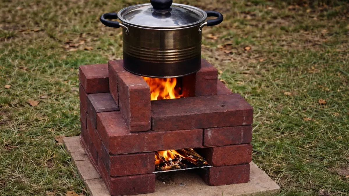 Raketová kamna postavená z 24 starých cihel a plechu. Ohřejí vodu za 10 minut s poloviční spotřebou dřeva