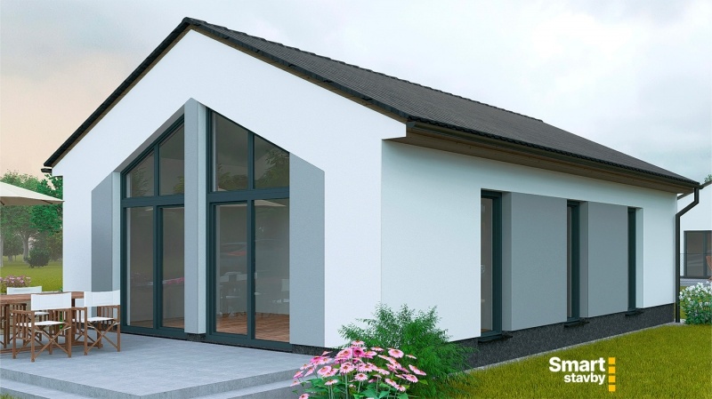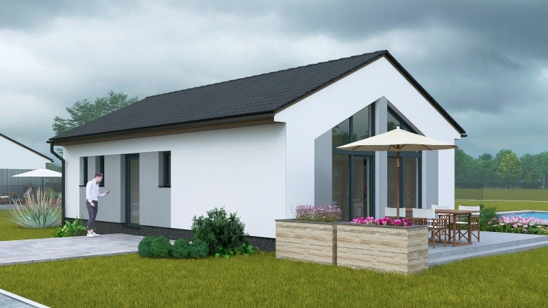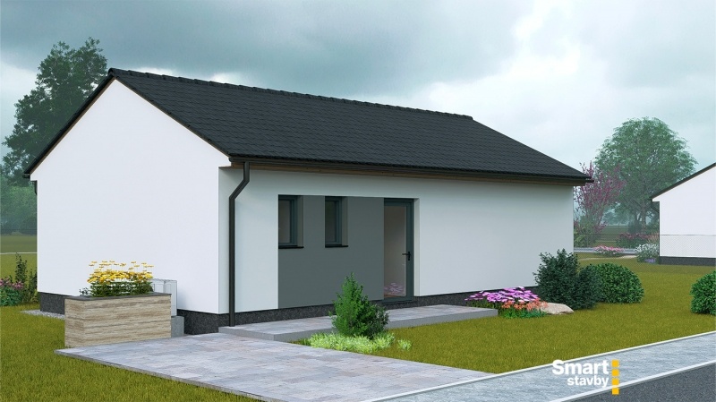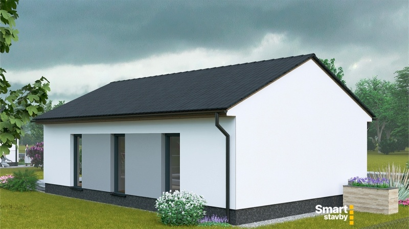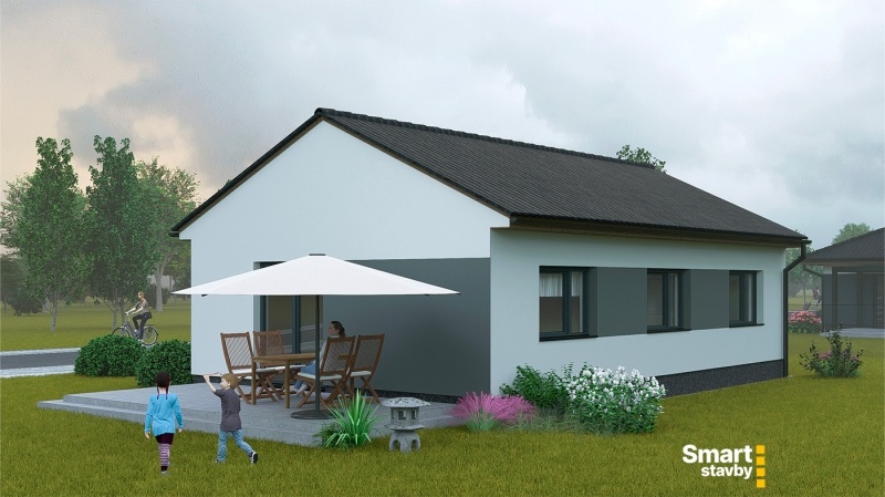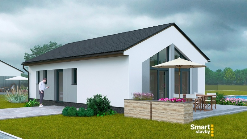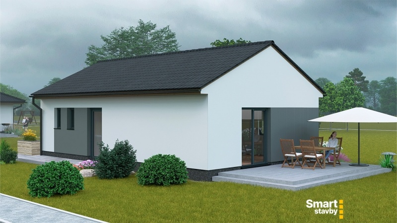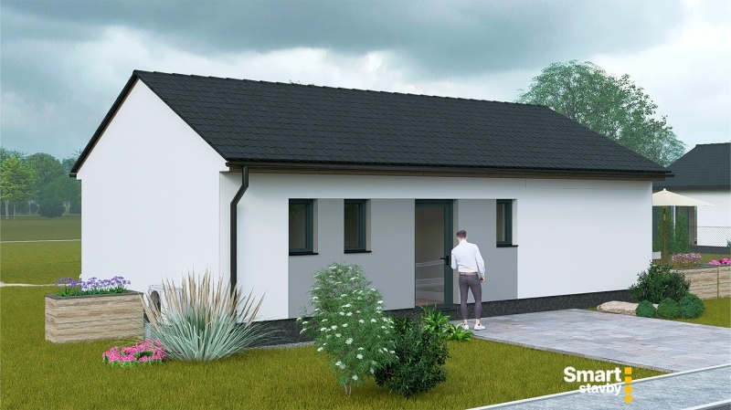 Bungalov SMART Výminek je navržen jako ideální startovací bydlení pro mladé páry nebo jako komfortní a bezbariérový dům na stáří. Tento dům s dispozicí 3 + kk efektivně využívá každý metr čtvereční.