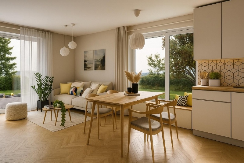 Chytře navržená dispozice nabízí prostorný obývací pokoj, kuchyni s jídelnou i terasu. Samozřejmostí jsou dva dětské pokoje, ložnice a koupelna oddělená od toalety.