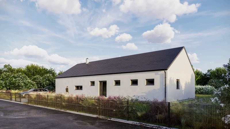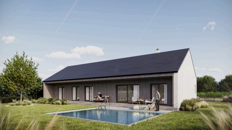 Přízemní dům pro rodinný život bez kompromisů Tento prostorný dům je navržen tak, aby splnil potřeby i větší rodiny. Nabízí tři dětské pokoje, z nichž každý má přímý vstup na terasu, a útulnou ložnici