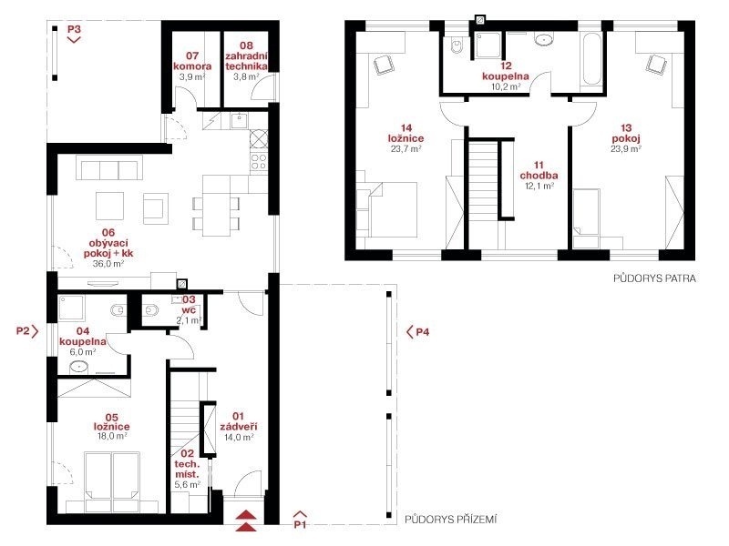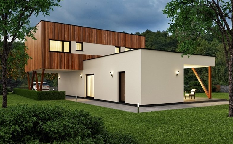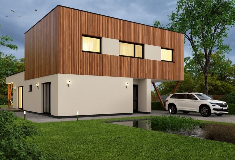 Moderní patrový dům s dispozicí 4+kk a plochou střechou jistě nadchne všechny fanoušky moderního designu. Hmota domu je tvořena dvěma kvádry, které jsou navzájem pootočeny o 90 stupňů.