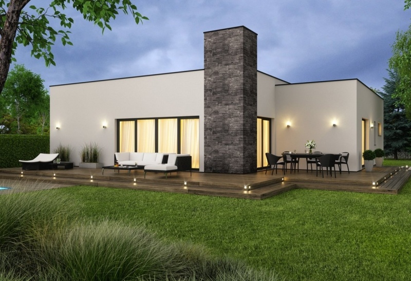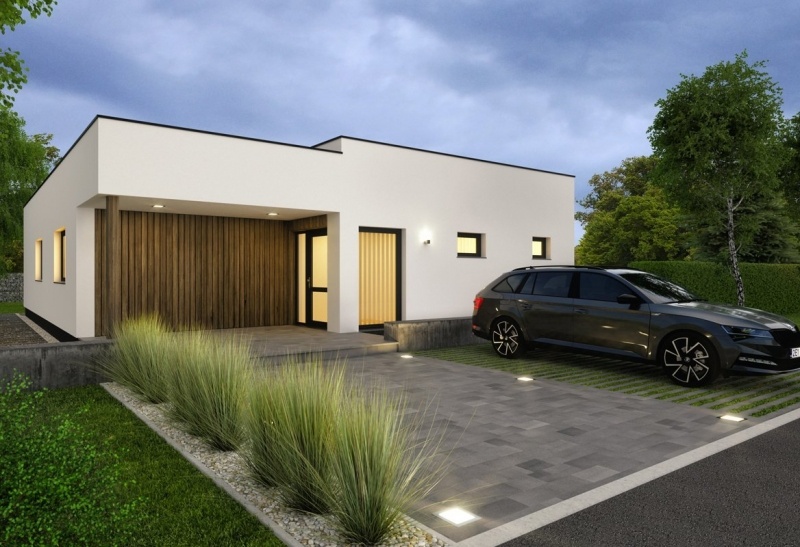 Moderní 4pokojový bungalov s elegantními liniemi a plochou střechou jistě nadchne všechny, kdo mají rádi jednoduchý a nadčasový design.