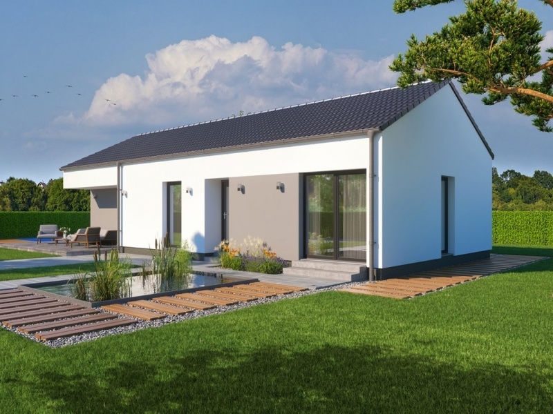 Bungalov VXD B87 patří mezi nejoblíbenější 4pokojové bungalovy z naší nabídky. Sedlová střecha dodává domu klasický vzhled, přesto si ale bungalov zachovává moderní ráz.